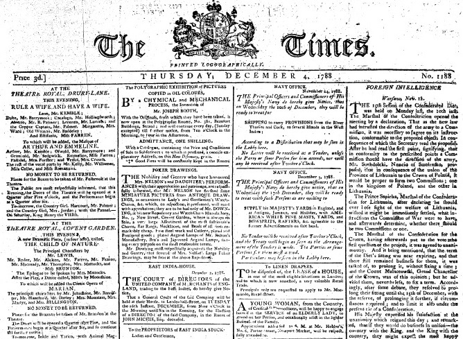 Una de las primeras personas que invirtió por la prensa concebida como negocio fue John Walker con The Times, el primer diario inglés que se creó bajo esta idea. También destacó por crear la primera red de corresponsales, por la especialización de sus trabajadores en diferentes áreas dentro del periódico y por la creación de la letra Times New Roman.