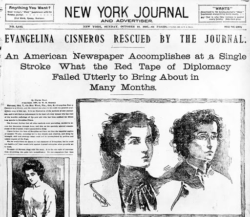 Una de las historias más destacadas que contó el periódico de Hearst fue la de Evangelina Cisneros, conocida como ‘la belleza latina’. Hearst la presentó como víctima de los españoles y organizó de todo alrededor de esta mujer. El momento cumbre del relato en su periódico llegó cuando mandó a un supuesto ‘periodista’ a que liberara a Evangelina de la cárcel. Este periodista, que en realidad era un sicario, la liberó y la llevó a Nueva York donde recibió una gran acogida.