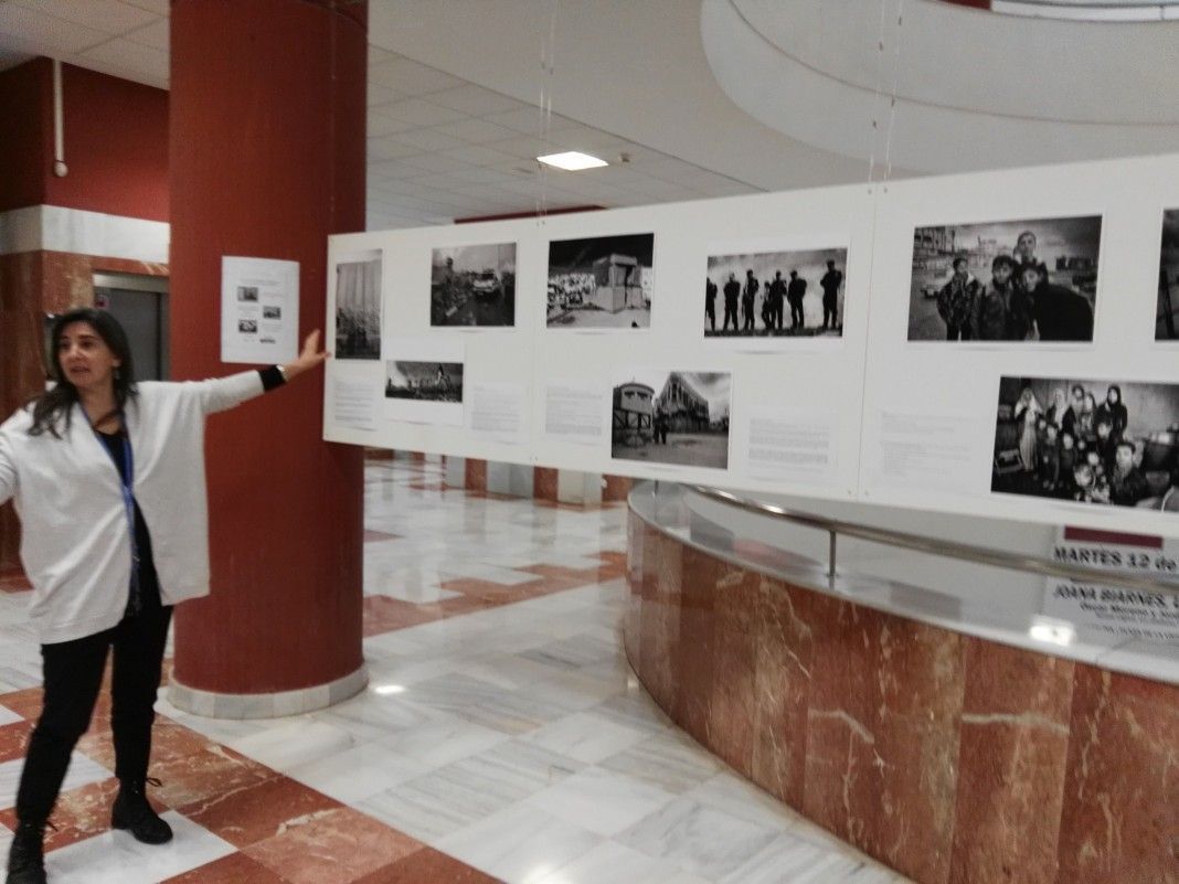 No hubo que esperar a entrar en el Aula Magna Lope de Rueda, comenzaron la charla fuera de la sala, en el hall donde se encontraba la muestra fotográfica. Allí empezaron a explicar de qué trataba todo.