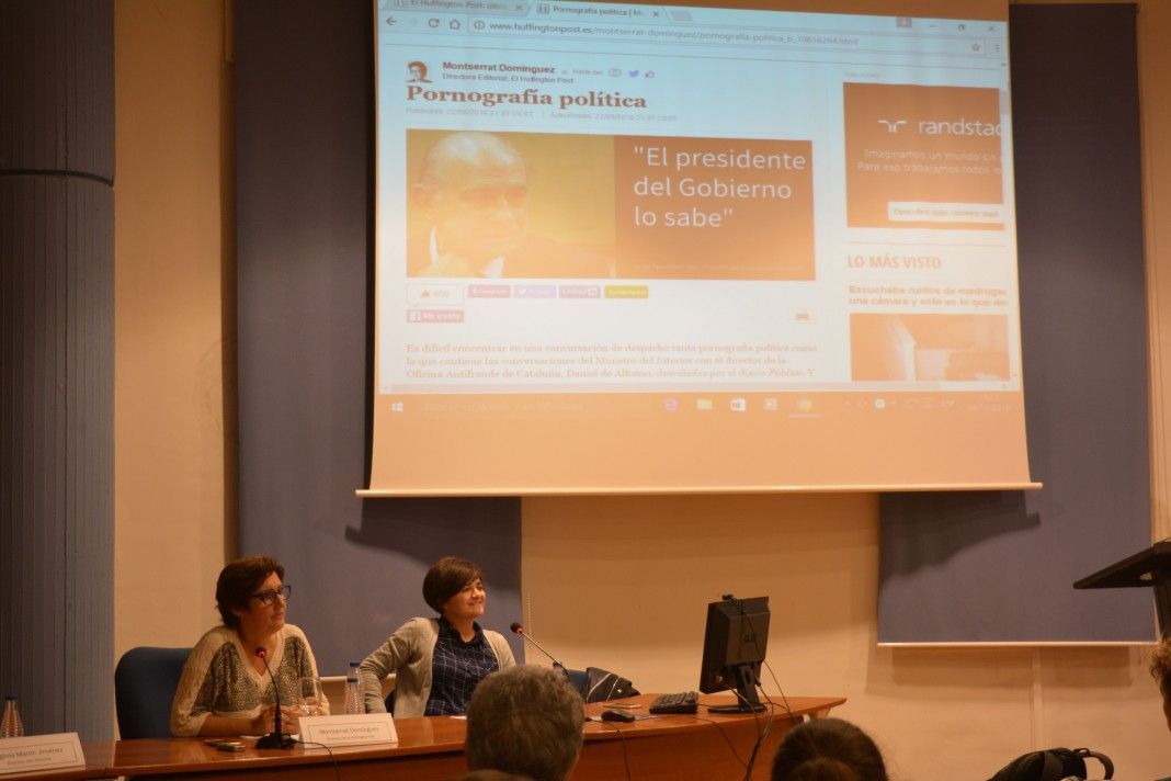 Domínguez finalizó su ponencia con la célebre cita de Gabriel García Márquez, “El periodismo es el oficio más bello del mundo”, y explicó cómo lo aplica a su día a día y aseguró los alumnos que no hay ninguna mañana que no se levante sintiéndose «una absoluta privilegiada» por tener la oportunidad de interpretar el mundo que le rodea y contárselo a sus ciudadanos. Entonces llegó el momento de la ronda de preguntas, donde los asistentes, tanto alumnos como profesores, le cuestionaban sobre cómo se trabajaba en El Huffington Post. Una de las alumnas, Andrea Gutiérrez, despertó la atención del resto de presentes. Preguntó a Montserrat por qué eligió un título en especial para una noticia de política: ‘Pornografía política’. La periodista se mostró confusa porque no se acordaba de a la qué noticia se refería, hasta Dunia Etura, la profesora que presentó a la periodista, la proyectó en la pantalla de la sala de juntas. Montserrat hizo memoria y explicó que el contenido político que aparecía en la información le parecía como una orgía, un sinsentido en el que los políticos se respaldan unos a otros. Cuando todos los alumnos vieron solucionadas sus dudas, la periodista no dudó en responder a los curiosos que se acercaron después de la conferencia para charlar o grabar entrevistas improvisadas. Y es que en el oficio más bello del mundo el aprendizaje nunca termina.